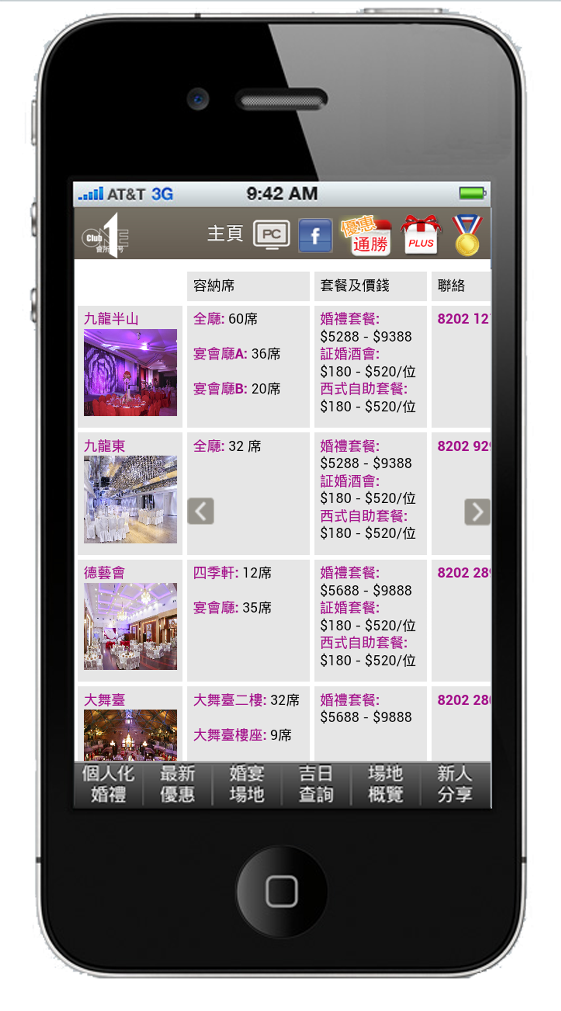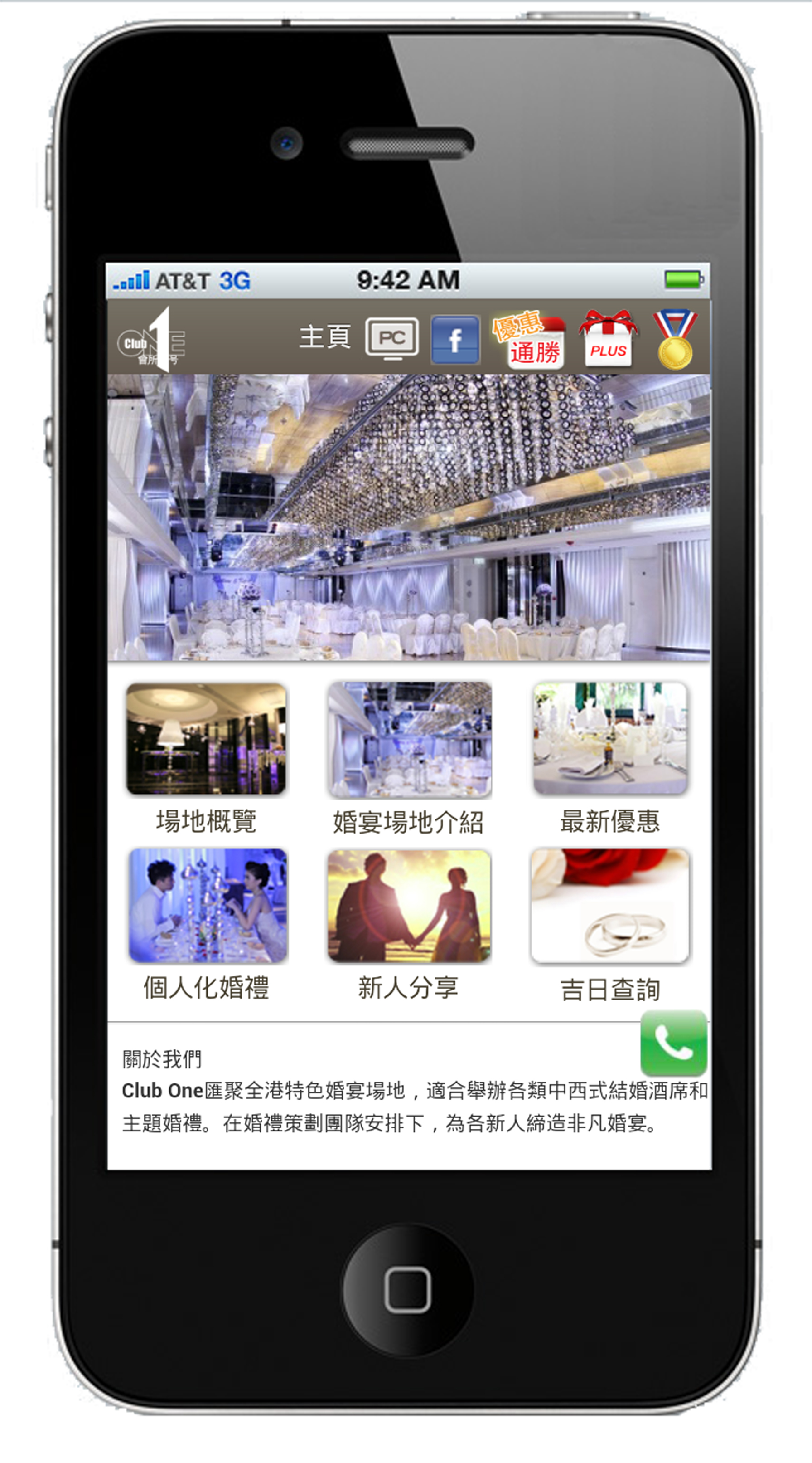 ClubONE手機網包含所有場地資料,客戶可方便瀏覽所有內容。大家也可以利用ClubONE這個手機網站,從「場地概覽」一欄中發現,ClubONE各場地的資訊,如席數、餐單、地址和電話;「婚宴場地介紹」,為你介紹ClubONE的不同婚宴場地;「個人化婚禮」,展示可以為你們度身訂造個人化的婚禮;「吉日查詢」,以最快捷的方式為你選取心儀吉日;「最新優惠」,展現ClubONE予貴客的不同優惠,「個人婚享」則讓各位準新人及新人分享他們的心得。