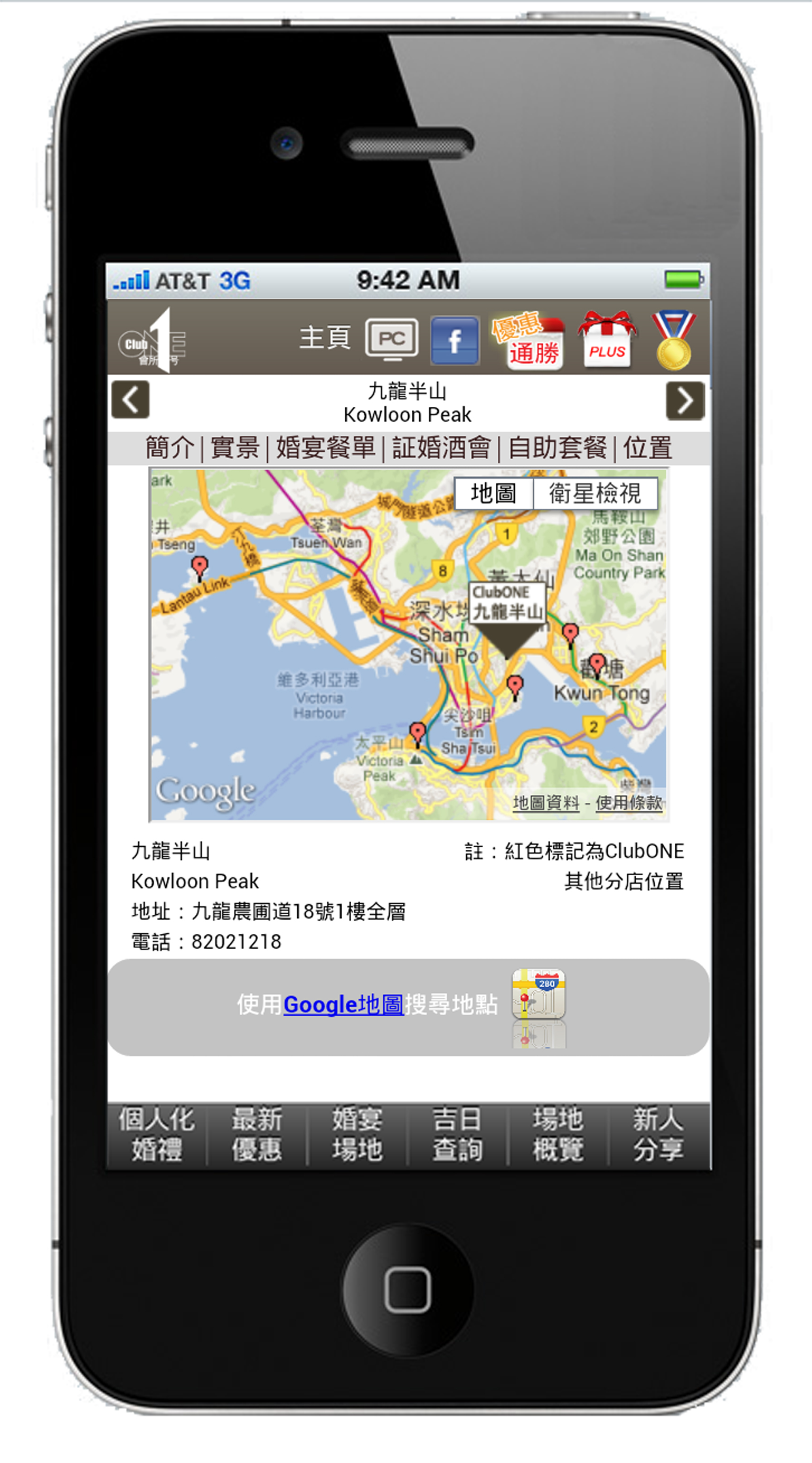 為方便用戶使用此手機網找尋場地的位置,ClubONE手機網內的地圖,方便貴客查閱各場地的位置及顯示各分店位置外,並可即時縮放,更整合手機內的Google Map App定位指示去向。