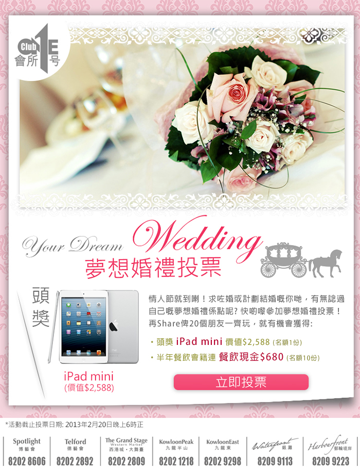 參加【Your Dream Wedding 夢想婚禮】投票活動!揀選你心目中的Dream Wedding,再Share20個朋友一齊參與投票,就有機會獲得頭獎iPad mini 價值$2,588 (名額1)及半年餐飲會籍#連餐飲現金$680 (名額10)